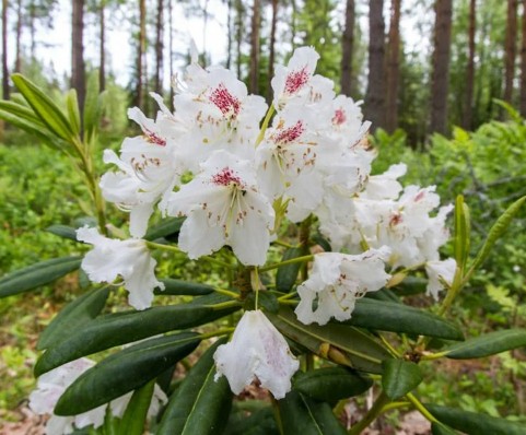 Рододендрон Тигерштэт (Tigerstedt) — это вечнозеленый кустарник, достигающий высоты до 1,5 метров. Его цветение начинается в конце мая, радуя крупными белыми цветками диаметром 5,5–7 см, украшенными коричнево-фиолетовыми пятнами на верхнем лепестке. Листья растения гладкие, темно-зеленого цвета, длиной 15–20 см. Этот сорт отличается высокой морозостойкостью, выдерживая температуры до –36 °С.