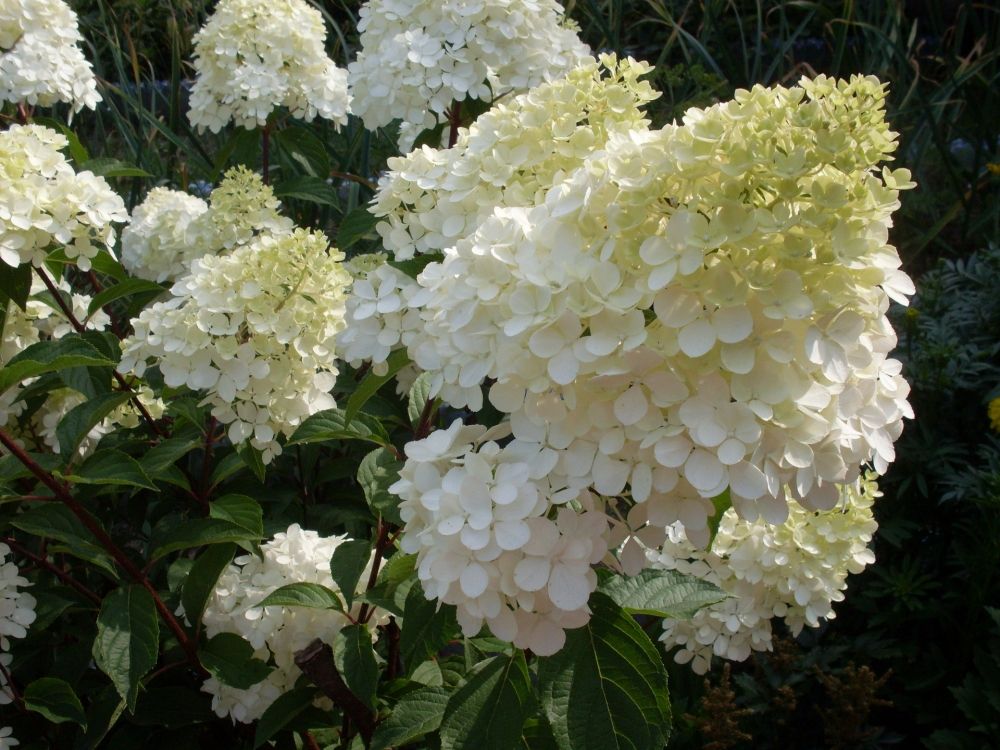Гортензия метельчатая Кэндллайт (Candlelight) представляет собой великолепный кустарник, достигающий высоты 1.2 метра. Его сильные, тёмно-бордовые побеги, которые в верхней части приобретают почти фиолетовый оттенок, создают эффектный контраст с пышными соцветиями. В начале цветения цветочки имеют зеленоватый оттенок, который постепенно переходит в зеленовато-белый и бело-кремовый, а затем появляются золотистые и желтые тона. Тяжелые соцветия склоняются под собственной тяжестью, придавая кусту особую декоративность.