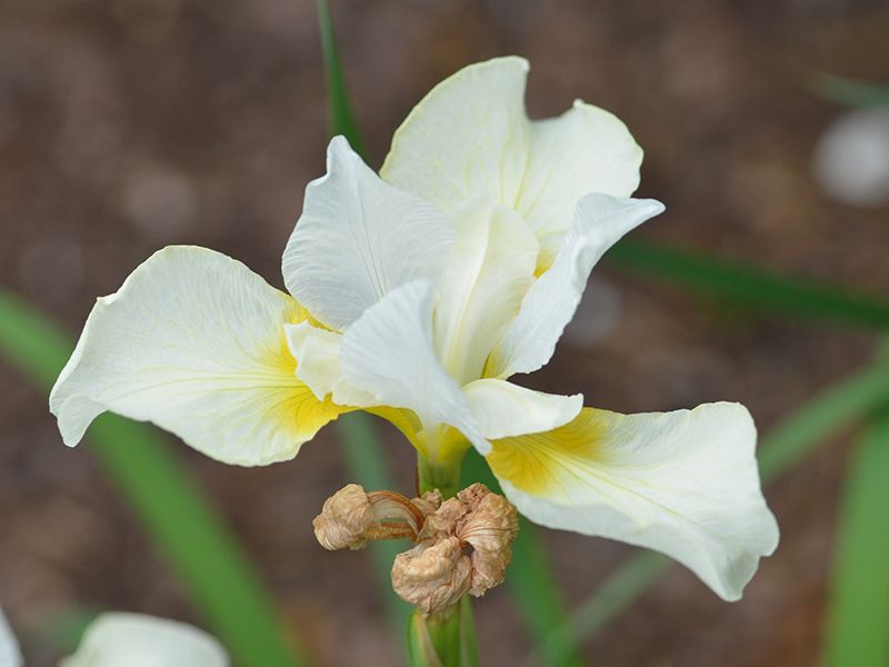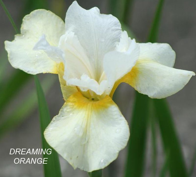 Саженец сибирского ириса Dreaming Orange представляет собой изысканный цветок с белыми лепестками, которые имеют легкий персиковый оттенок и "хрустальную" текстуру. На фолах можно заметить небольшие желто-оранжевые сигналы, словно выглядывающие изнутри. Этот сорт ириса отличается влаголюбивостью, но не переносит постоянного переувлажнения.
