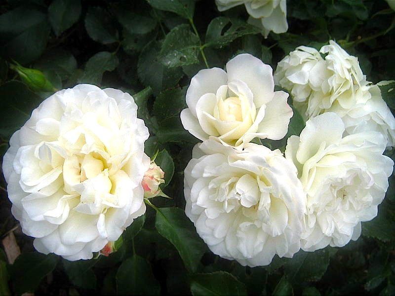 Цветки махровые, среднего размера (6-8 см), собраны в соцветия по 5-10 штук. Побеги толстые, светло-зеленые и жесткие, с многочисленными светлыми шипами. Этот сорт полностью морозостойкий и отличается обильным и продолжительным цветением, что делает его отличным выбором для посадки на газонах и в контейнерах. Блан Мейдиланд также теневынослив, что расширяет возможности его использования в саду.
