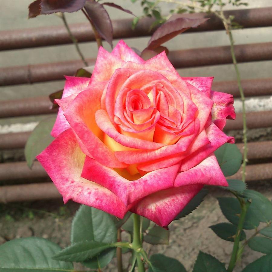 Роза Утопия – это изысканная двухцветная чайно-гибридная роза, которая станет украшением любого сада. Кусты этой розы вырастают до 90-120 см в высоту, имеют прямостоячую форму и густую тёмно-зелёную листву с восковым налётом. Цветы крупные, диаметром 8-10 см, густо-махровые с высоким центром. Окраска лепестков поражает разнообразием: основной цвет – жёлтый, а края украшены широкой каймой насыщенного красно-малинового оттенка.