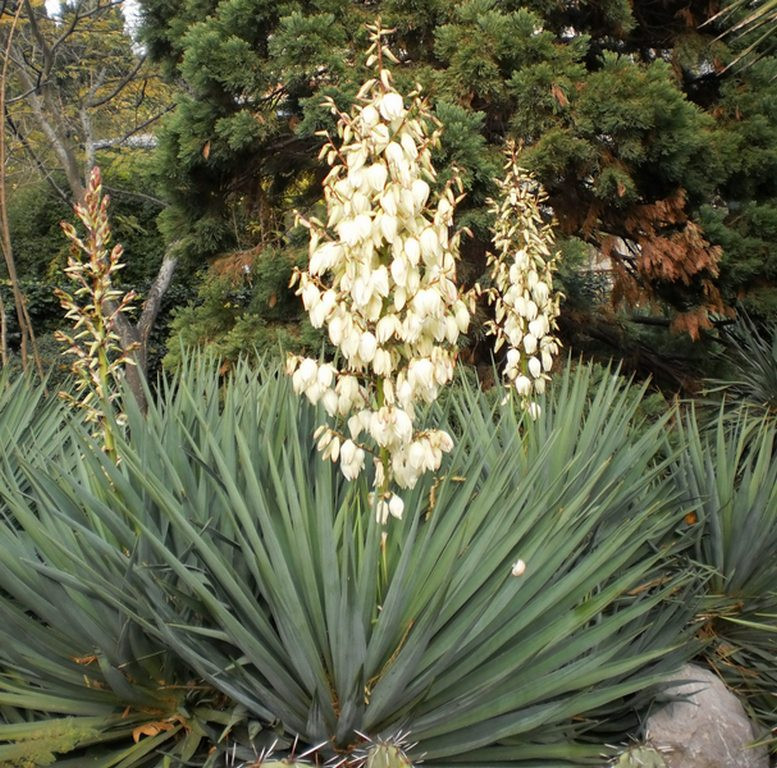 Юкка сизая (Yucca glauca) – это один из самых устойчивых и неприхотливых сортов. Она образует розетку из бледно-зеленых, кинжалообразных листьев длиной до 100 см. Цветонос достигает высоты около 1,3 метра и украшен колокольчатыми, зеленовато-белыми цветами, которые свисают вниз. Цветение происходит в середине лета и продолжается несколько недель, придавая саду особую декоративность. После цветения образуются древесные, продолговатые кремовые семенные капсулы.